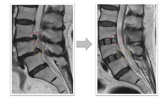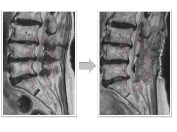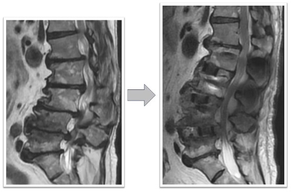 下肢痛、歩行障害、腰痛で来院、手術となりました。術前後のレントゲンで3椎間のOLIFによって術後側弯症が改善され、脊椎の並び(アライメント)が矯正されています(図3)。また、術前後のMRIでは施術した部位の椎間板ヘルニアおよび脊柱管狭窄がOLIFの間接除圧効果によって改善し、神経への圧迫が解除されています(図4)。術後は歩行可能、下肢痛腰痛も改善、また結果として数センチ身長が回復しています。