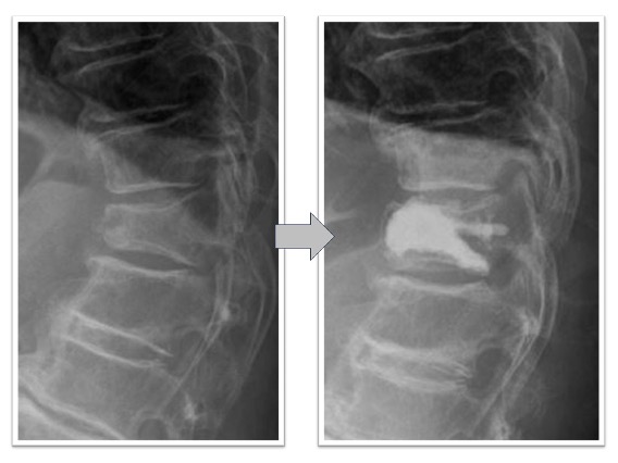 胸椎圧迫骨折後、遷延する腰痛と骨癒合不良を認めていた椎体に対してBKPを実施しています。治療後レントゲン画像では椎体内に注入された骨セメントと椎体高が改善していることが確認できます。腰痛改善し術翌日に退院となっています。
