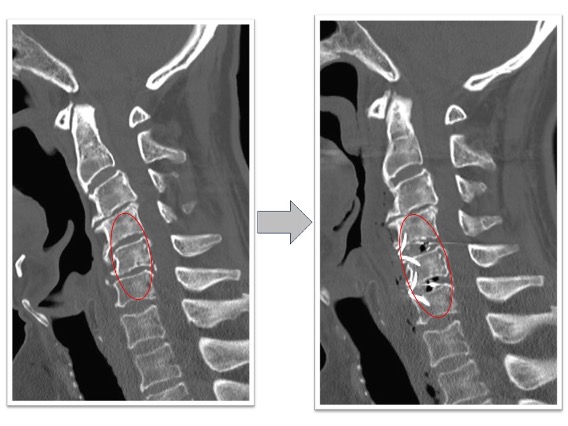 両上肢から肩にかけての痛み、頸部痛の患者様に対してC4/5/6の頚椎前方固定術を実施しました(赤丸)。術後には狭小化していた椎間高が回復し、さらに術前には同部位で頚椎の後弯(頚椎が後ろに凸となり頭が前に下がる状態)が認められていましたが、術後は頚椎の並び(アライメント)が改善しています。また、同時にこの断面では見えていませんが椎間孔も上下に拡張することで術後にあった肩から上腕への痛みが術後消失しています。