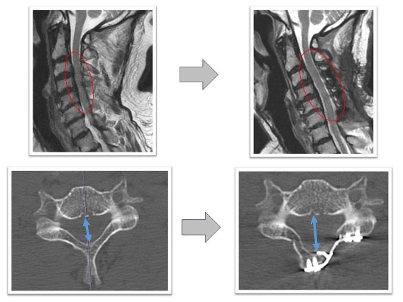 上肢の運動障害、歩行障害の患者様に対して頚椎椎弓形成術を実施。術後MRI画像で頚髄の圧迫が解除され頚髄前後にスペースが生まれています(図赤丸)。また、CT画像では術前後の比較で脊柱管の前後幅が約1.5倍以上に拡大していることが確認できます(図青矢印)。術後は歩行安定し、上肢運動も改善しています。