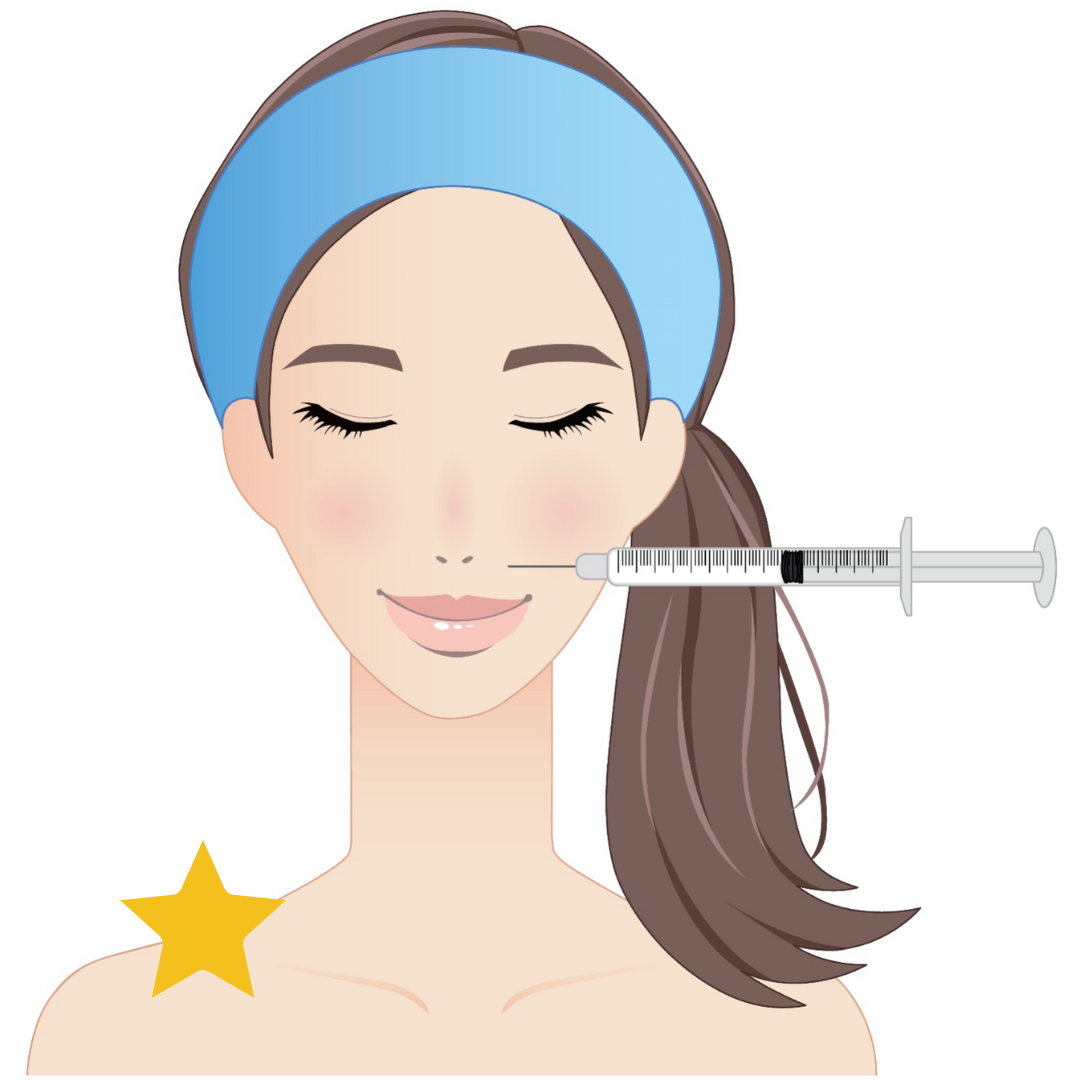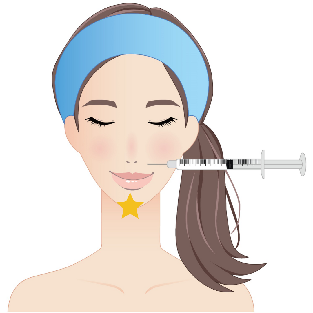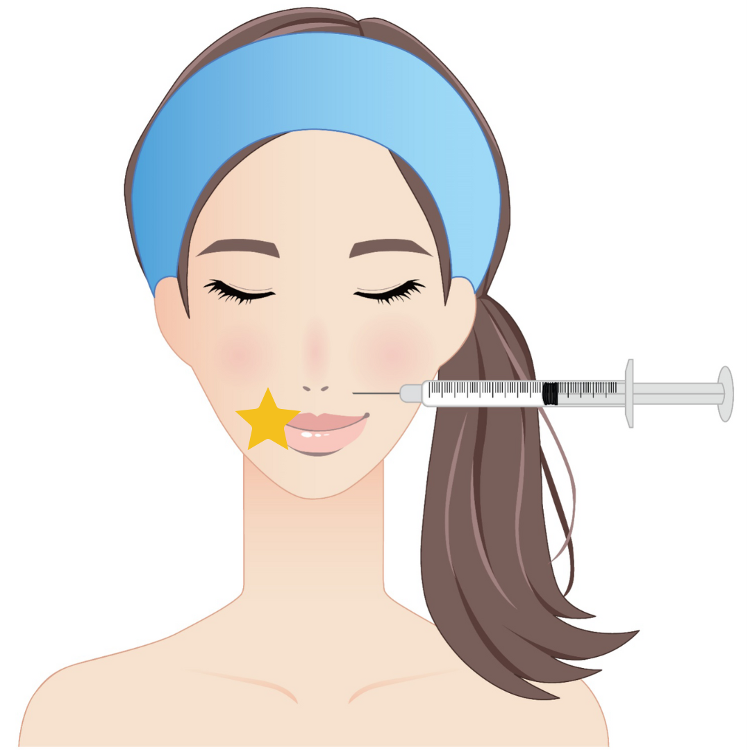 両側の口角にボツリヌス毒素を注入することによって口角下制筋を抑制し、口角を上げることで若々しく見せる効果があります。副作用としては口角を下に下げる筋肉が麻痺するため、口の周りが動かしにくくなる可能性があります。通常両側で8単位〜のボトックスを使用します。