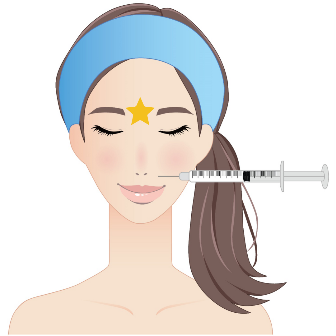 おでこの前頭筋に8〜12箇所程度ボツリヌス毒素を注入することによっておでこの皺を防ぎます。継続することで、おでこに皺が刻まれるのを防ぐ効果もあります。通常、副作用としては、両側の眉が上がり吊り目になる、おでこの皺が一部に偏る、目が少し開きにくくなることなどがあります。通常20単位〜のボトックスを使用します。